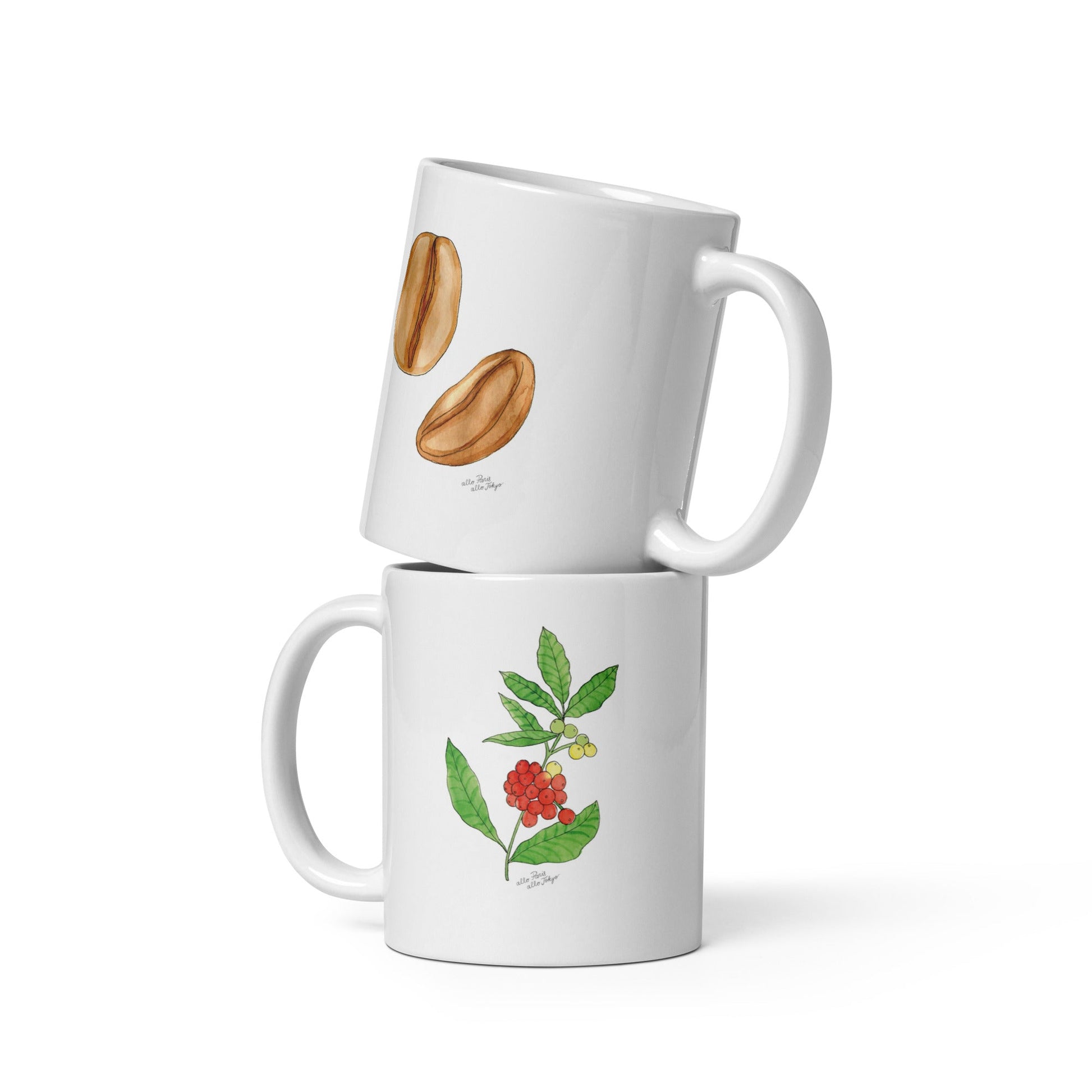 Whether you're drinking your morning coffee, evening tea, or something in between—this mug's for you! Coffee beans and coffee plants in a harmonious crisp white mug.